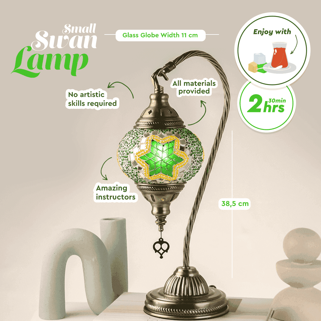 Our workshops are designed for beginners, so everyone is welcome to join. By the end of this 2.5-hour class, you’ll have your very own handcrafted mosaic lamp to take home, along with unforgettable memories.