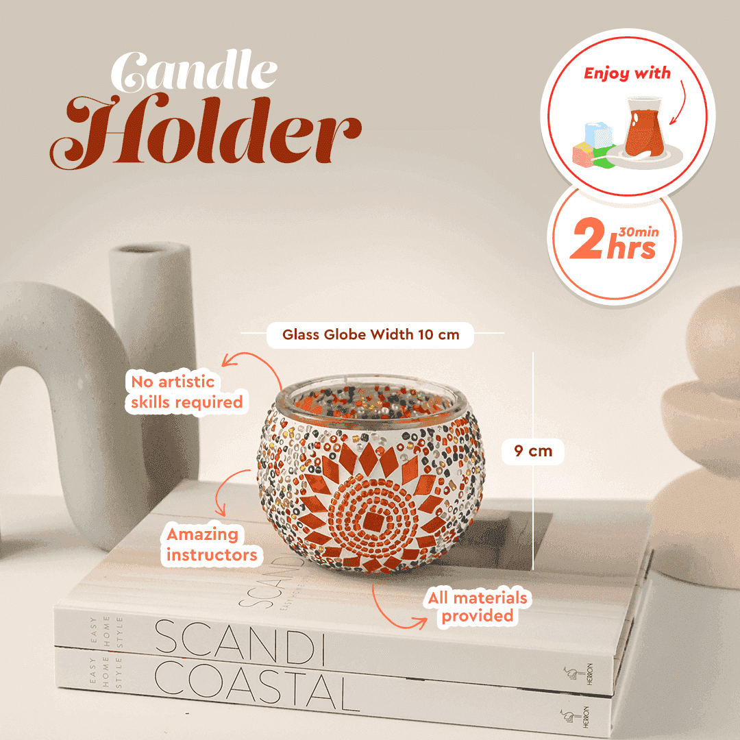 Our workshops are designed for beginners, so everyone is welcome to join. By the end of this 2.5-hour class, you’ll have your very own handcrafted mosaic lamp to take home, along with unforgettable memories.